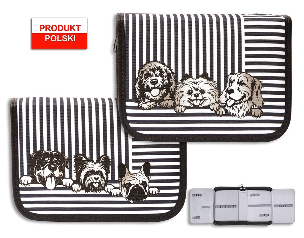 Piórnik twardy z 2 klapkami w środku, wykonany z kodury, ozdobiony nadrukiem przedstawiającym psy wykonanym w technologii sublimacji. W środku piórnika znajdują się gumki umożliwiające trzymanie długopisów. Piórnik o wymiarach 20x14x5[cm]. Pakowany po 16 sztuk w 4 wersjach kolorystycznych. Piórnik bez wyposażenia.