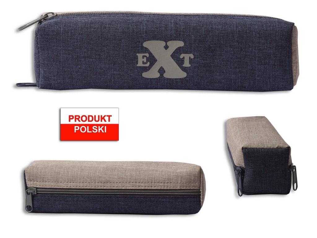 Piórnik w kształcie klocka uszyty z kodury. Piórnik posiada 2 komory, a co za tym idzie 2 zamki błyskawiczne, ozdobiony nadrukiem EXT wykonanym w technologii termotransferu. Piórnik o wymiarach 20x4,5x4,5[cm]. Piórnik bez wyposażenia.