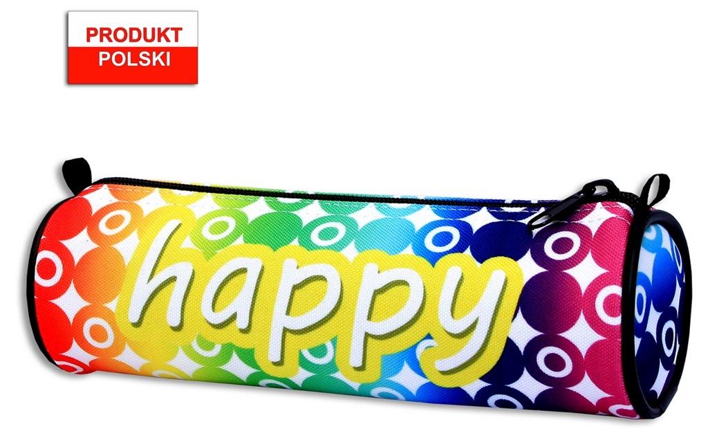 Piórnik tuba wykonany z kodury, ozdobionej nadrukiem przedstawiającym grafikę HAPPY wykonanym w technologii sublimacji. Piórnik o wymiarach 21x7[cm]. Piórnik bez wyposażenia.
