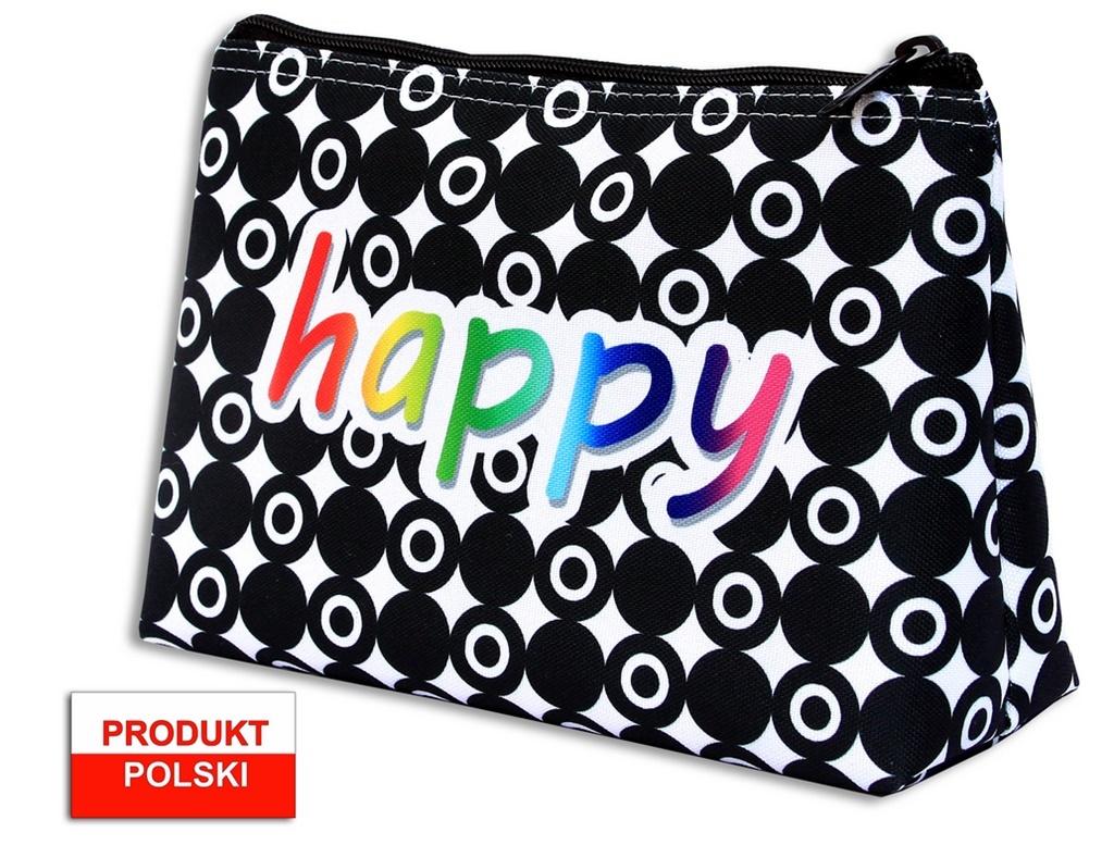 Kosmetyczka wykonana z kodury, ozdobionej nadrukiem przedstawiającym grafikę HAPPY wykonanym w technologii sublimacji. Kosmetyczka o wymiarach 21,5x8[cm]. Piórnik bez wyposażenia.