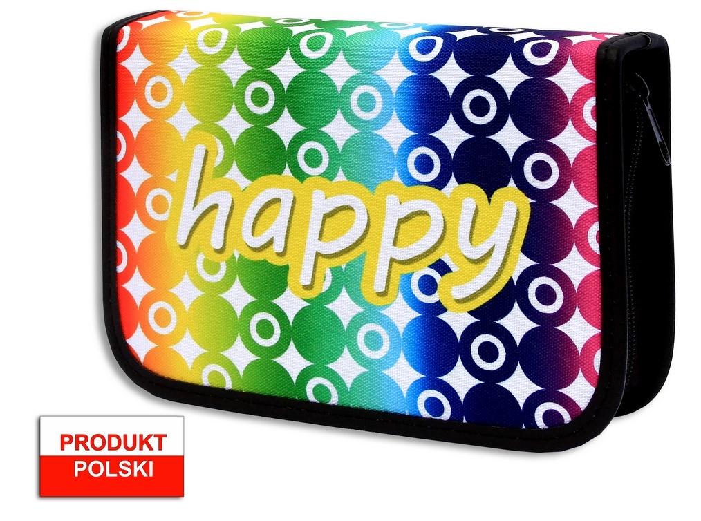 Piórnik twardy z 2 klapkami w środku wykonany z kodury, ozdobiony nadrukiem przedstawiającym grafikę HAPPY wykonanym w technologii sublimacji. W środku piórnika znajdują się gumki umożliwiające trzymanie długopisów. Piórnik o wymiarach 20x14x5[cm]. Piórnik bez wyposażenia.