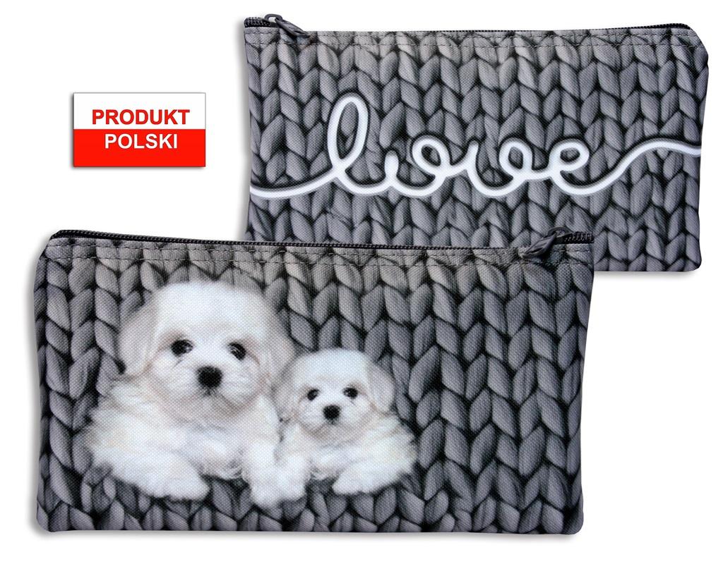 Piórnik szkolny płaski saszetka z pieskami wykonany z kordury, ozdobionej nadrukiem. Piórnik o wymiarach 21,5x11,5x0,5[cm]. w 3 wersjach kolorystycznych. Piórnik bez wyposażenia.