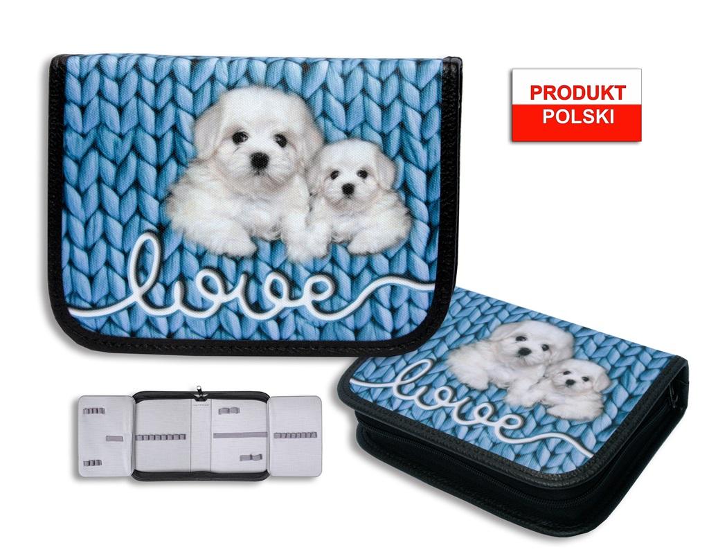 Piórnik twardy z 2 klapkami. Wykonany z kodury, ozdobiony nadrukiem przedstawiającym pieski wykonanym w technologii sublimacji. W środku piórnika znajdują się gumki umożliwiające trzymanie długopisów. Piórnik o wymiarach 20x14x5[cm]. Pakowany po 16 sztuk w 3 wersjach kolorystycznych. Piórnik bez wyposażenia.