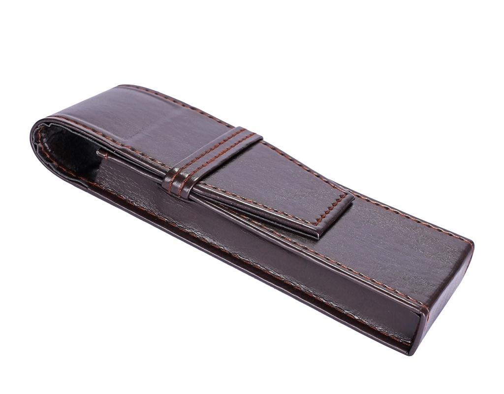 Etui na długopisy wykonane ze skaju, zamykane na przewlekany pasek. Etui o wymiarach 17x6x1,8[cm]. Kolor brązowy