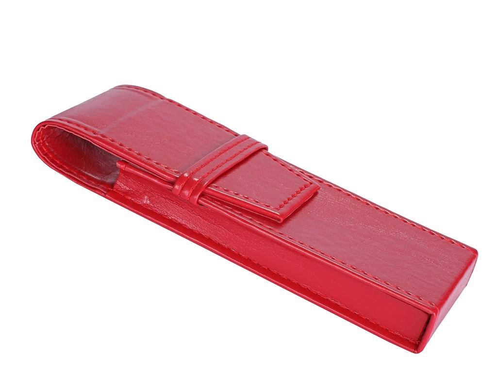 Etui na długopisy wykonane ze skaju, zamykane na przewlekany pasek. Etui o wymiarach 17x6x1,8[cm]. Kolor czerwony