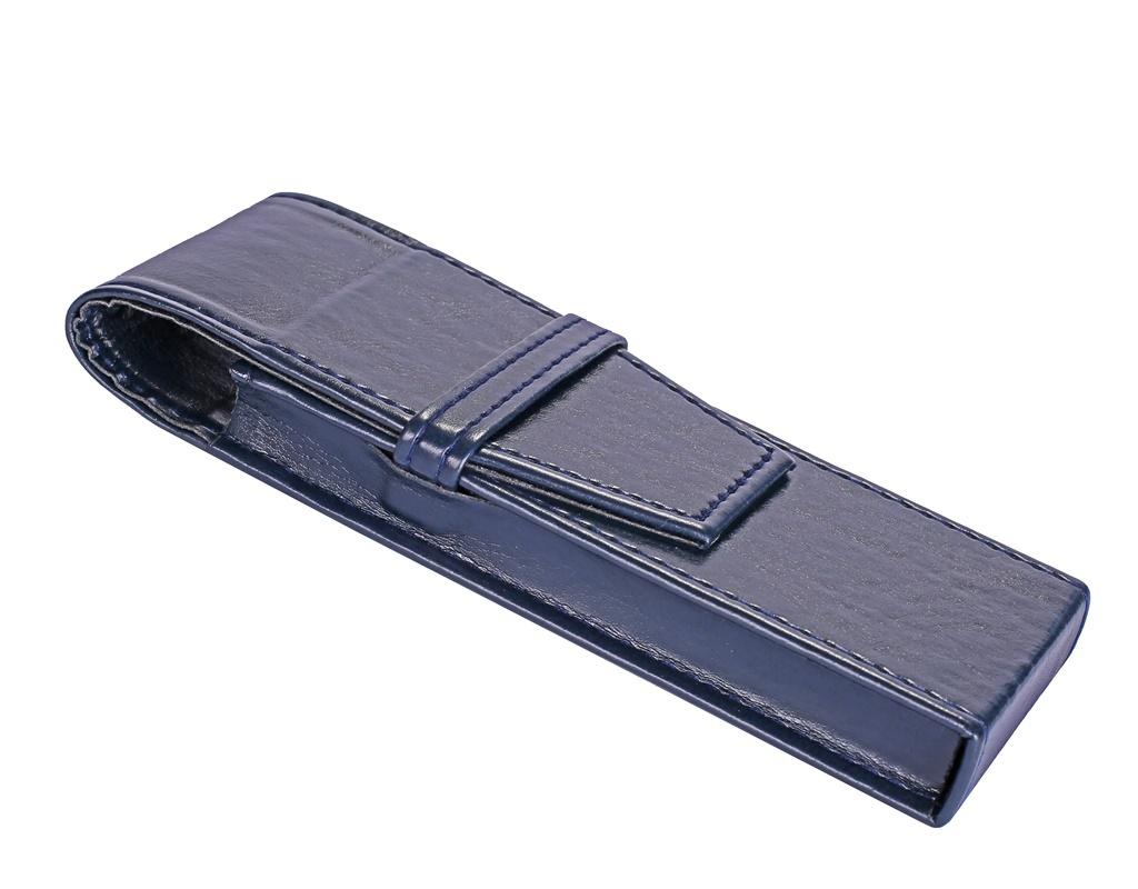 Etui na długopisy wykonane ze skaju, zamykane na przewlekany pasek. Etui o wymiarach 17x6x1,8[cm]. Kolor granatowy