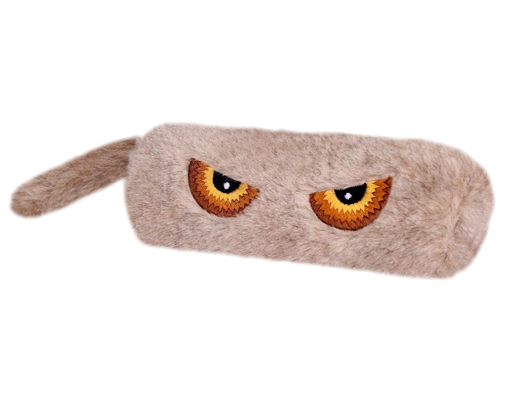 Piórnik tuba uszyty z futra, ozdobiony haftem przedstawiającym oczy. Piórnik o wymiarach 21x7[cm]. Kolor beżowy