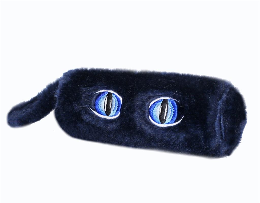 Piórnik tuba uszyty z futra, ozdobiony haftem przedstawiającym oczy.Piórnik o wymiarach 21x7[cm].Kolor granatowy
