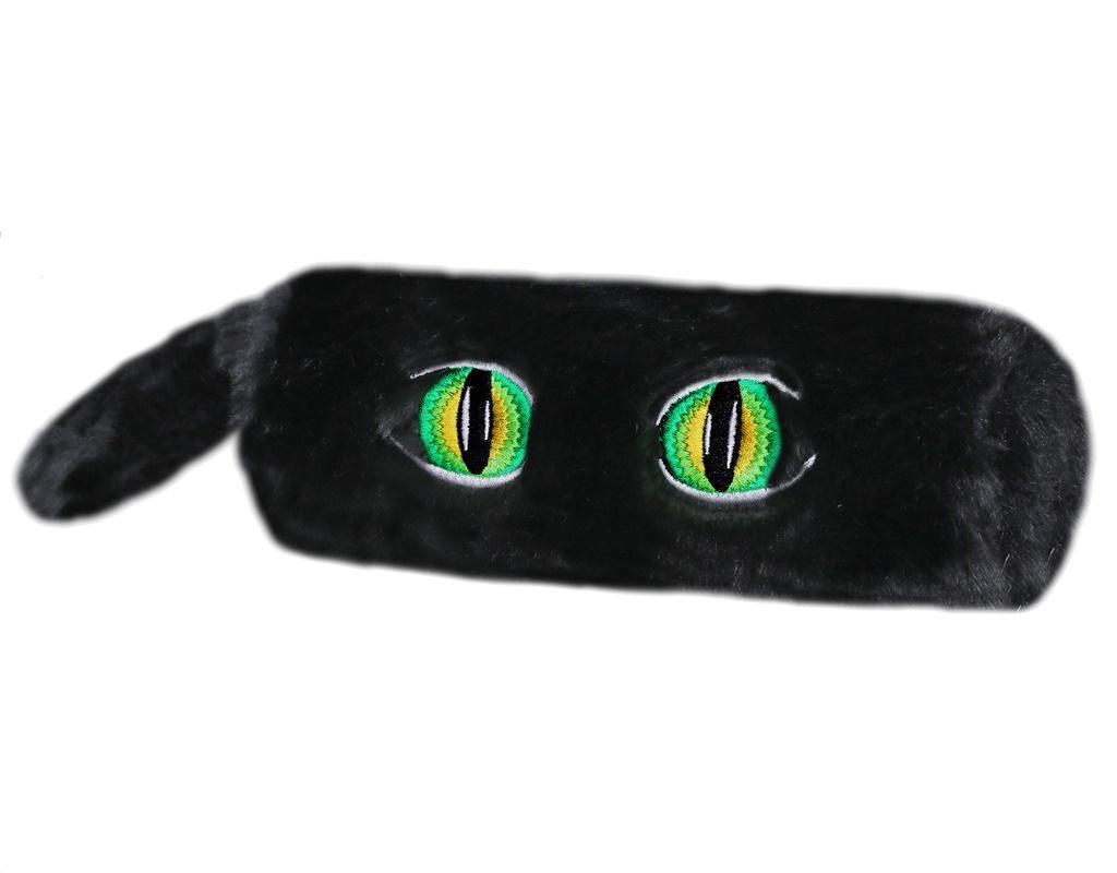 Piórnik tuba uszyty z futra, ozdobiony haftem przedstawiającym oczy. Piórnik o wymiarach 21x7[cm]. Kolor czarny