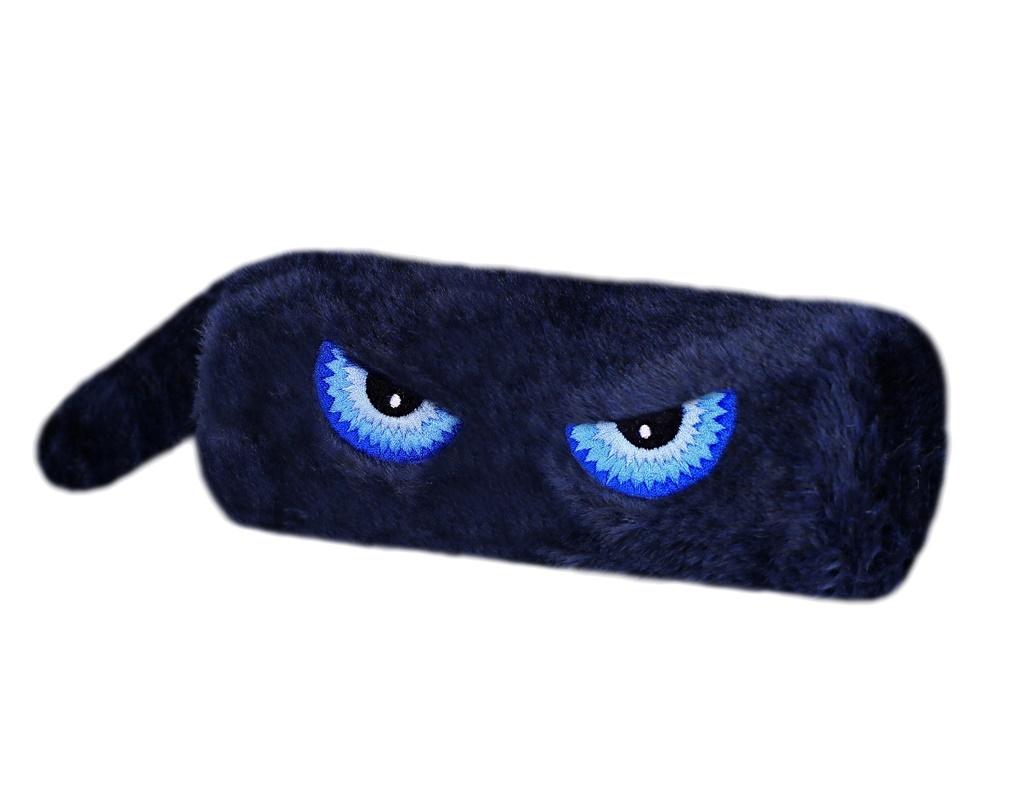 Piórnik tuba uszyty z futra, ozdobiony haftem przedstawiającym oczy. Piórnik o wymiarach 21x7[cm]. Kolor granatowy