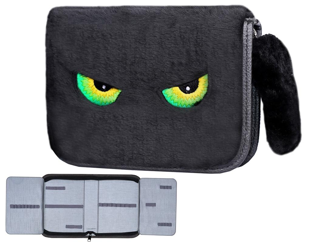 Piórnik z 2 klapkami w środku uszyty z futra, ozdobiony haftem. Piórnik o wymiarach 20x14x5[cm].Kolor czarny