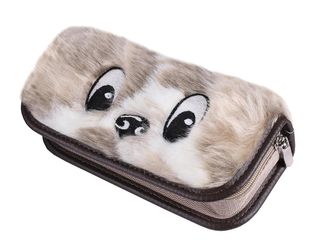 Kuferek uszyty z futra, ozdobiony haftem.Piórnik o wymiarach 20x8x5[cm].Kolor beżowy