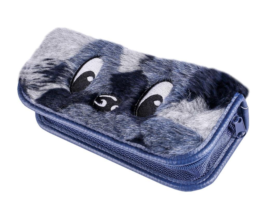 Kuferek uszyty z futra, ozdobiony haftem.Piórnik o wymiarach 20x8x5[cm].Kolor granatowy