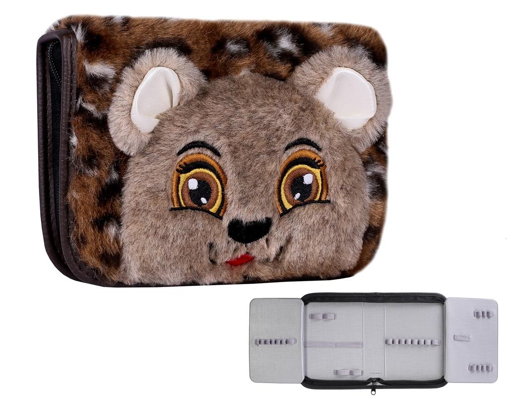 Piórnik z 2 klapkami w środku uszyty z futra, ozdobiony haftem. Piórnik o wymiarach 20x14x5[cm]. Kolor brązowy