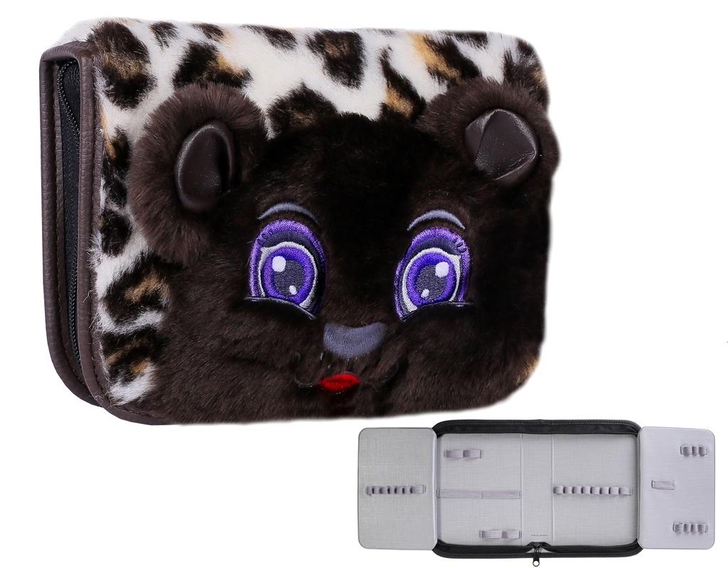 Piórnik z 2 klapkami w środku uszyty z futra, ozdobiony haftem. Piórnik o wymiarach 20x14x5[cm]. Kolor brązowy