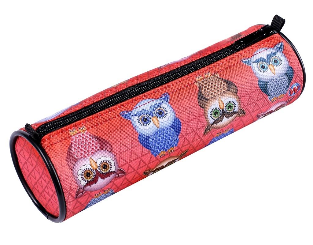 Piórnik tuba uszyty z kodury, ozdobionej wzorem sowy. Piórnik o wymiarach 21x7[cm]. Kolor czerwony