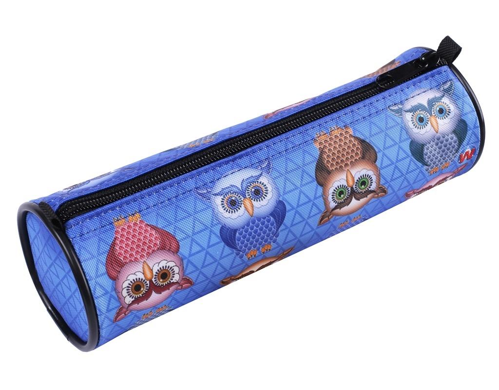 Piórnik tuba uszyty z kodury, ozdobionej wzorem sowy. Piórnik o wymiarach 21x7[cm]. Kolor niebieski