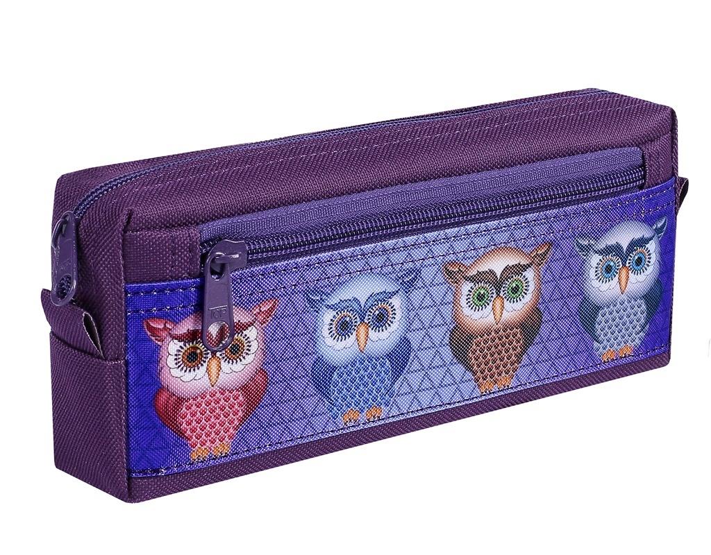 Kosmetyczka uszyta z kodury, ozdobiona wzorem sowy.Piórnik o wymiarach 20x9x5[cm].Kolor fioletowy