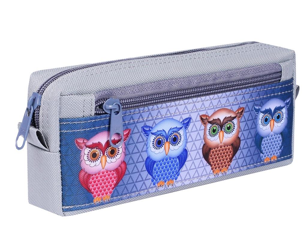 Kosmetyczka uszyta z kodury, ozdobiona wzorem sowy.Piórnik o wymiarach 20x9x5[cm].Kolor szary