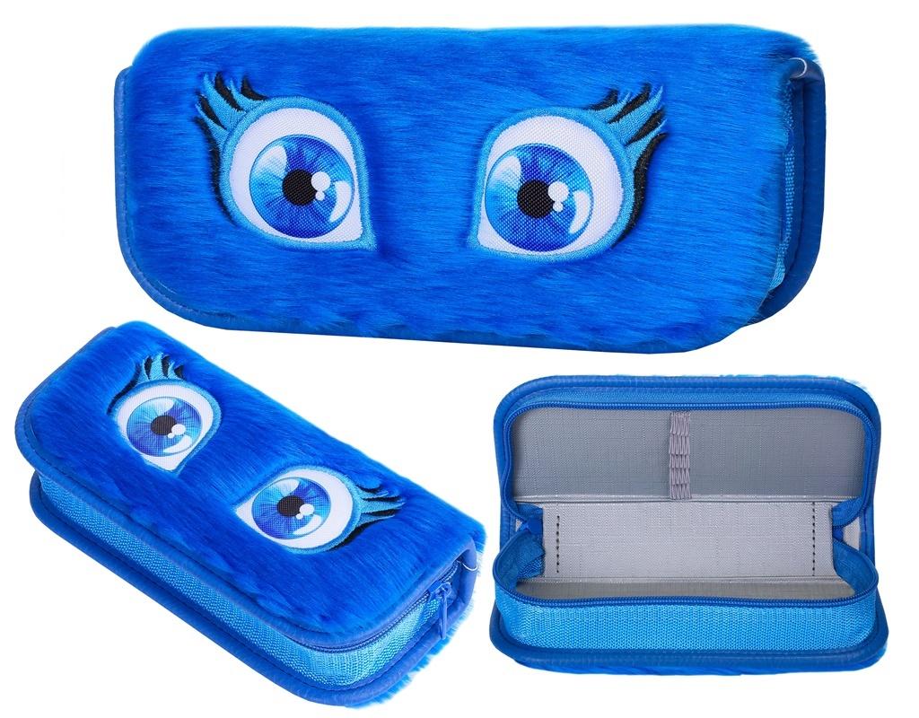 Kuferek uszyty z tkaniny futerkowej, aplikacja oczu. W środku piórnika znajdują się gumki umożliwiające trzymanie długopisów. Piórnik bez wyposażenia.