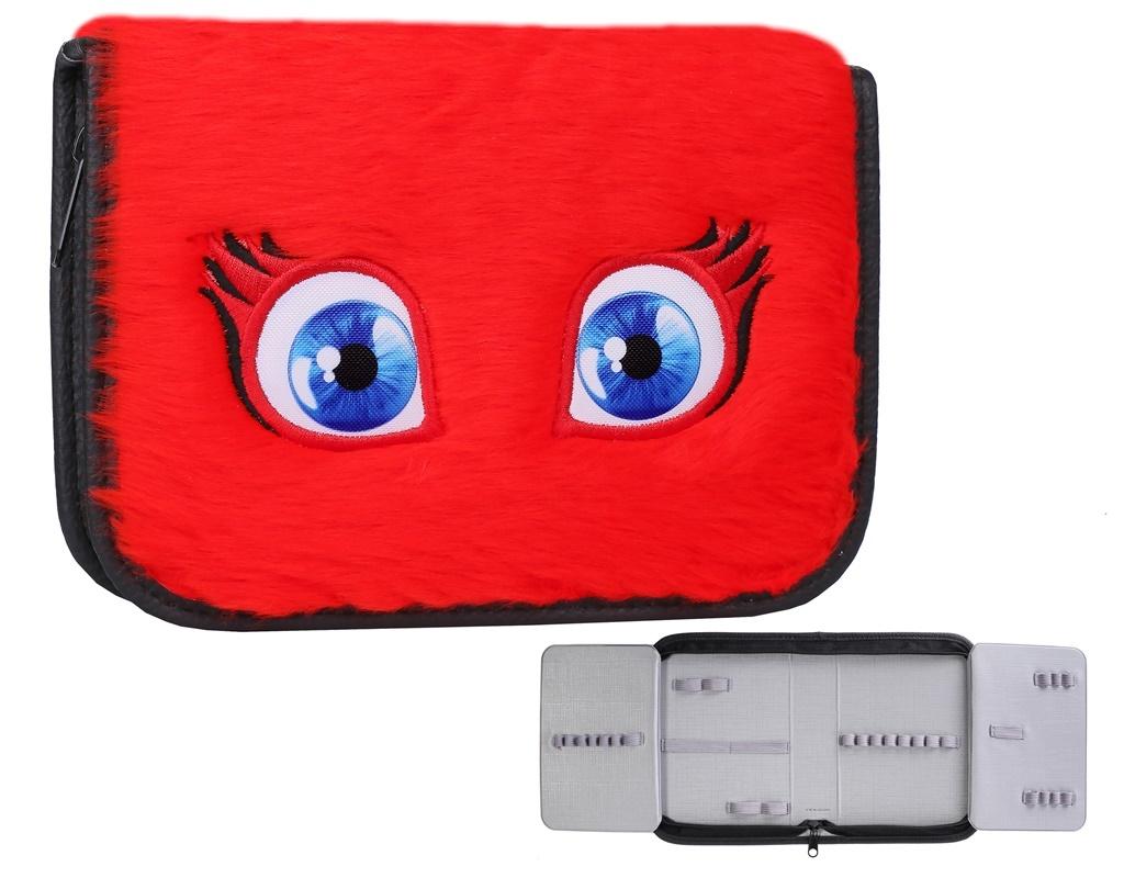 Piórnik twardy z tkaniny futerkowej, ozdobiony haftem. W środku znajdują się gumki na długopisy. Piórnik bez wyposażenia.