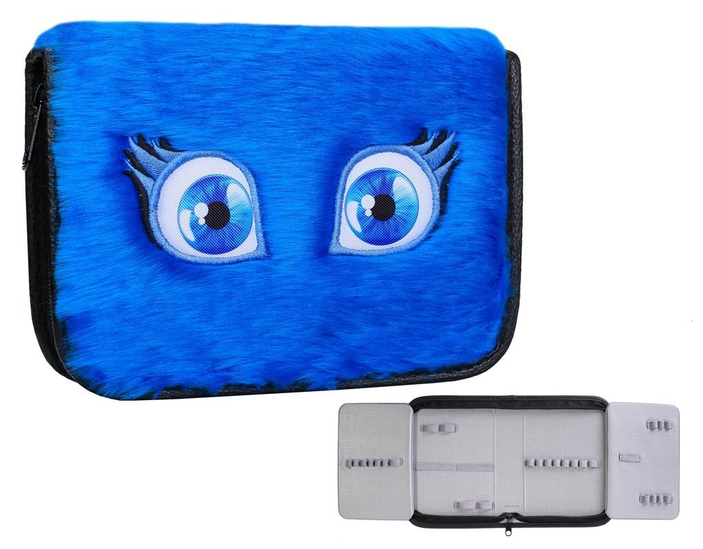 Piórnik twardy z 2 klapkami w środku uszyty z tkaniny futerkowej, ozdobiony haftem. W środku znajdują się gumki do trzymania długopisów. Piórnik bez wyposażenia.