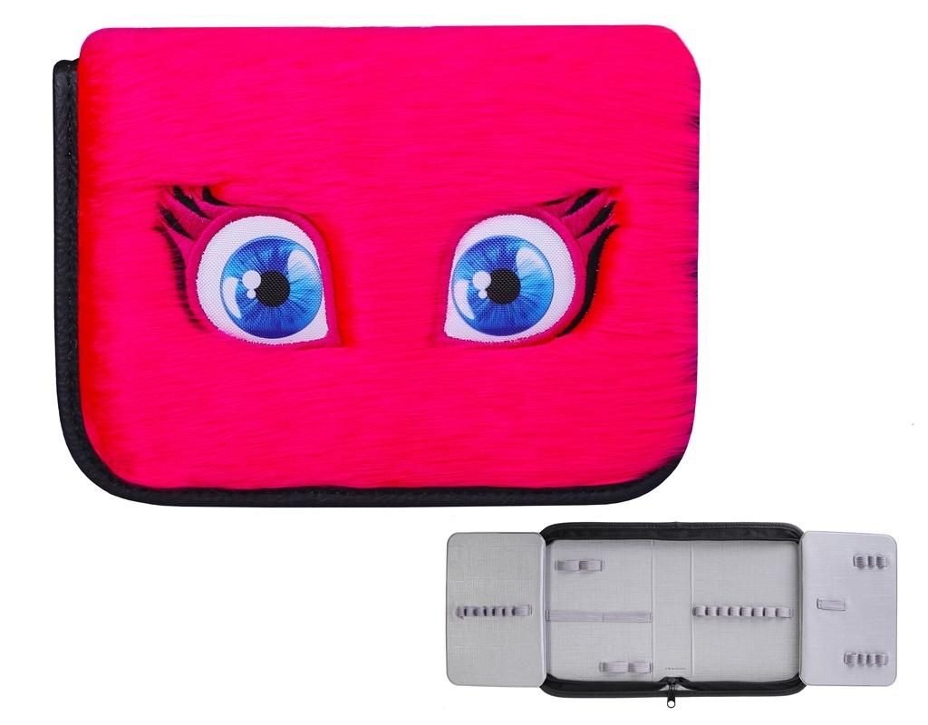 Piórnik twardy uszyty z tkaniny futerkowej, ozdobiony haftem. W środku znajdują się gumki na długopisy. Piórnik bez wyposażenia.