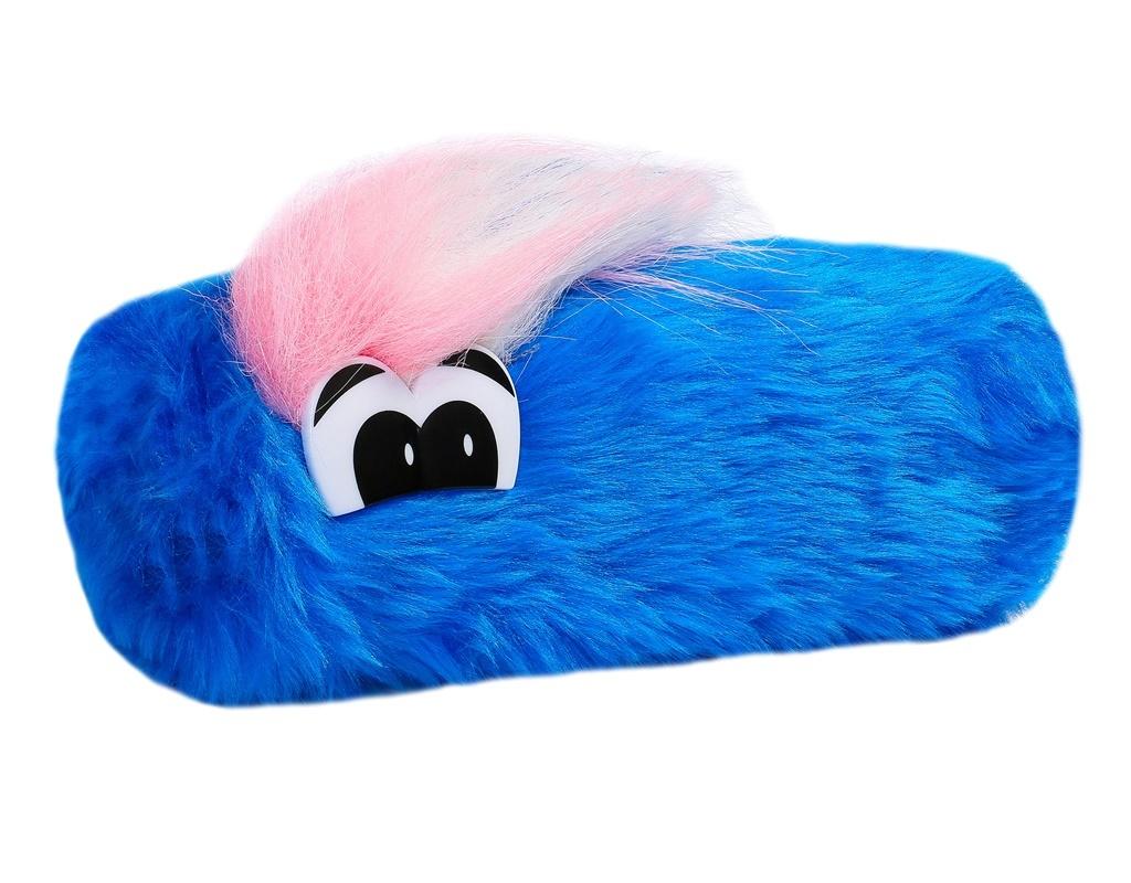 Piórnik tuba uszyty z tkaniny futerkowej, ozdobiony oczami oraz grzywką. Piórnik bez wyposażenia.