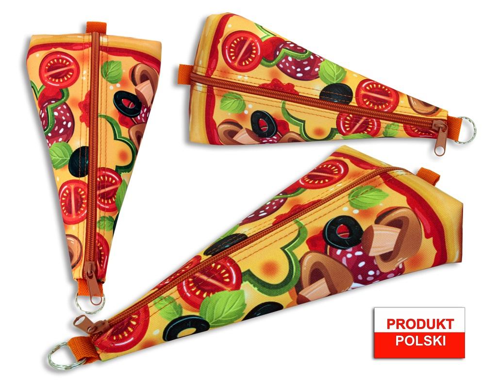 Piórnik dla dzieci, wykonany z kodury z nadrukiem w kształcie trójkąta. Przypomina kawałek pizzy. Piórnik o wymiarach 25,5x12x4,5[cm]. Piórnik bez wyposażenia.