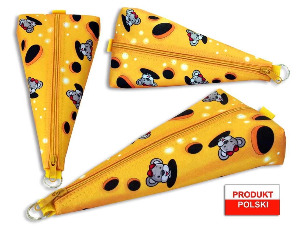 Piórnik dla dzieci, wykonany z kodury z nadrukiem w kształcie trójkąta. Przypomina kawałek ser. Piórnik o wymiarach 25,5x12x4,5[cm]. Piórnik bez wyposażenia.