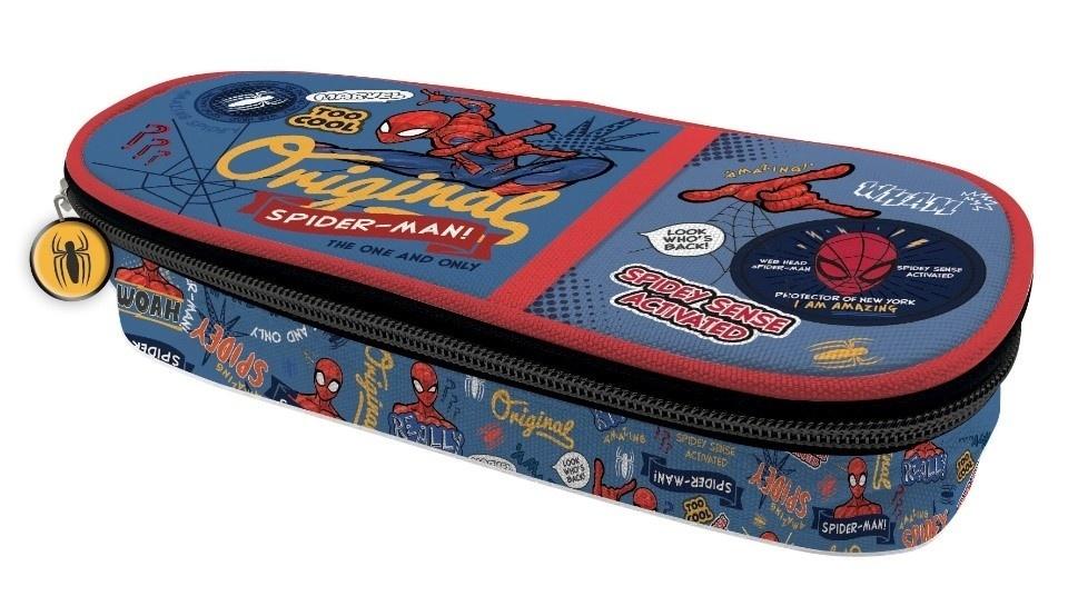 Owalny piórnik szkolny z klapką to niezbędny przedmiot uczniów. Wewnątrz na klapce znajdują się gumowe uchyty na przybory do pisania oraz skrzydło, na którym jest kieszonka z siateczki zamykana zamkiem błyskwicznym i kolejne gumowe uchwyty. Komora główna jest pojemna, korpus dodatkowo usztywniany. Na piórniku znajduje się motyw z serii Spider Man. Duży piórnik z organizerem oprócz najważniejszych przyborów szkolnych, pomieści także m. in. pomadkę ochronną, chusteczki czy mały krem do rąk. Dzięki ruchomej przekładce, można oddzielić produkty kosmetyczne od szkolnych .Wyróżnia się na tle konkurecji tym, że dłuższy.