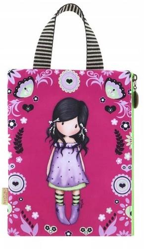 Bardzo poręczna torba, piórnik A5 z wizerunkiem dziewczynki Gorjuss, w odcieniach bzu i cukierkowego różu.