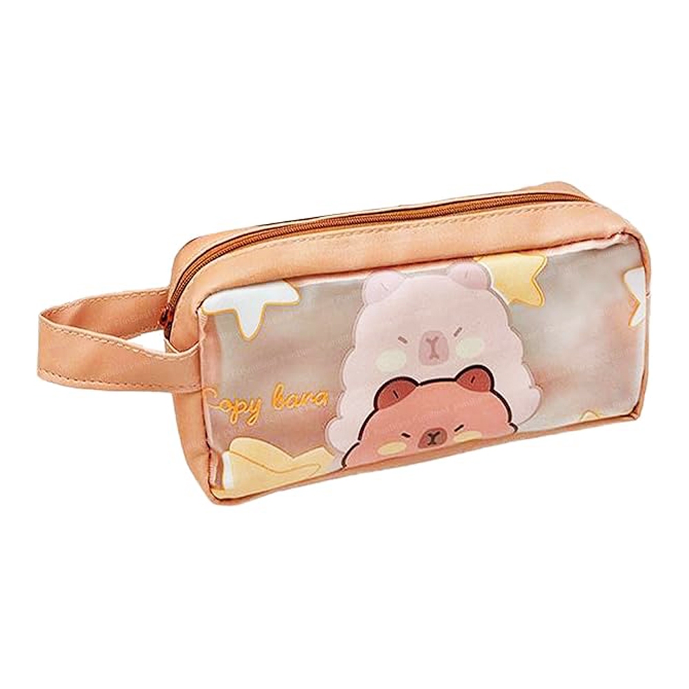 Transparentny piórnik z motywem kapibary o wymiarach 20 x 9,5 x 5 cm.