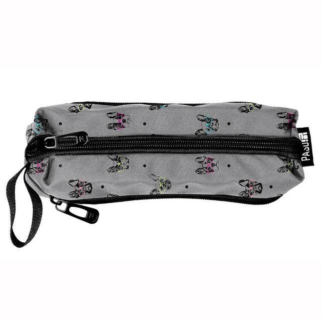 Piórnik szary w pieski, przybornik trzykomorowy. Idealny na dodatkowe akcesoria szkolne. Wyposażony jest w trzy zapinane na zamek przegródki umożliwiające zachowanie porządku. Stanowi świetny dodatek do klasycznych piórników, które nie pomieszczą dodatkowych aksesoriów szkolnych, takich jak temperówka, klej, cyrkiel, korektor czy markery. Piórnik może służyć także jako etui lub mini-kosmetyczka. W Paso dbamy, aby nasze piórniki były funkcjonalne, lekkie i jednocześnie pakowne.