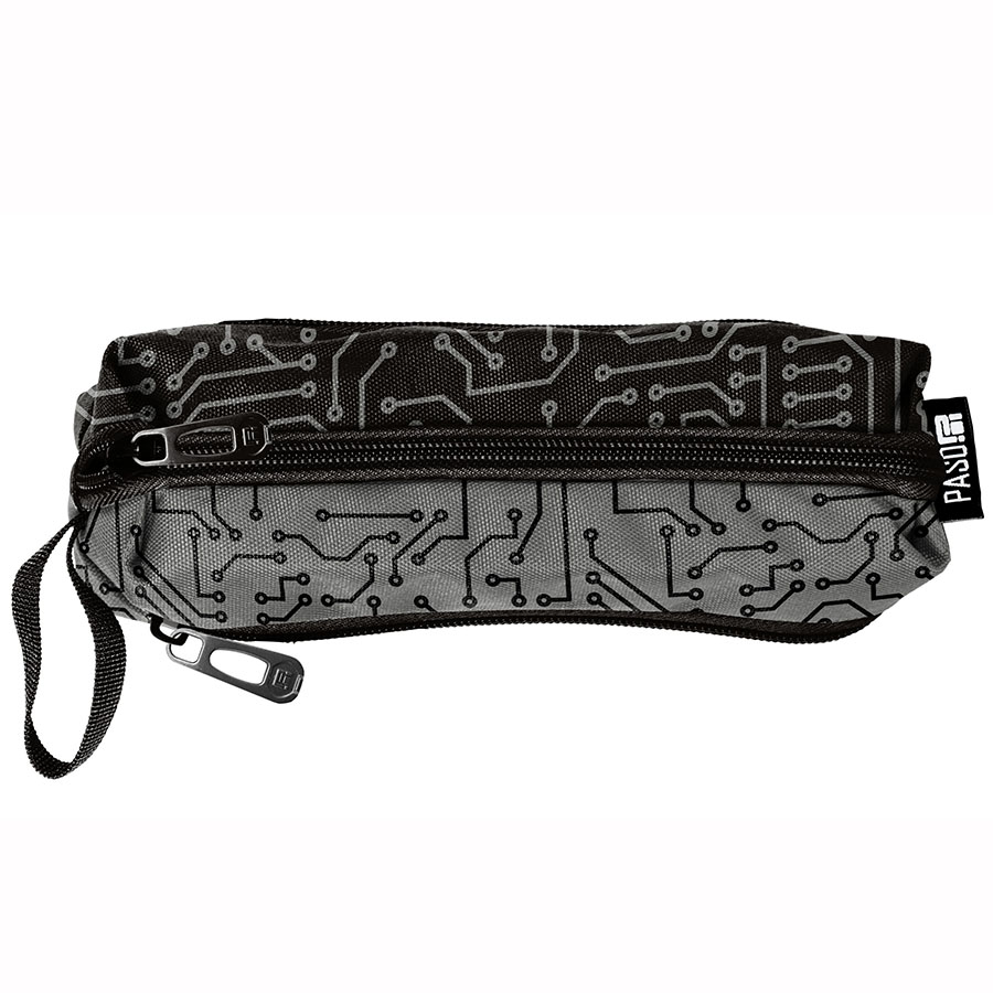 Piórnik, przybornik trzykomorowy szaro-czarny. Idealny na dodatkowe akcesoria szkolne. Wyposażony jest w trzy zapinane na zamek przegródki umożliwiające zachowanie porządku. Stanowi świetny dodatek do klasycznych piórników, które nie pomieszczą dodatkowych aksesoriów szkolnych, takich jak temperówka, klej, cyrkiel, korektor czy markery. Piórnik może służyć także jako etui lub mini-kosmetyczka. W Paso dbamy, aby nasze piórniki były funkcjonalne, lekkie i jednocześnie pakowne.