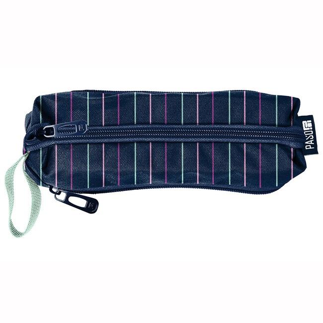 Piórnik, przybornik trzykomorowy granatowy w paski. Idealny na dodatkowe akcesoria szkolne. Wyposażony jest w trzy zapinane na zamek przegródki umożliwiające zachowanie porządku. Stanowi świetny dodatek do klasycznych piórników, które nie pomieszczą dodatkowych aksesoriów szkolnych, takich jak temperówka, klej, cyrkiel, korektor czy markery. Piórnik może służyć także jako etui lub mini-kosmetyczka. W Paso dbamy, aby nasze piórniki były funkcjonalne, lekkie i jednocześnie pakowne.