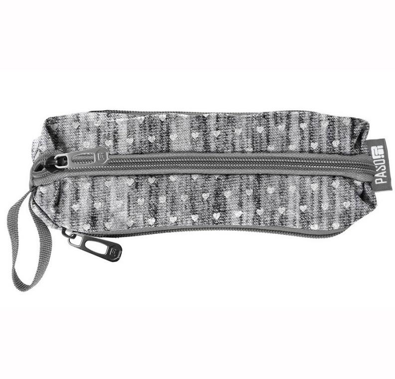 Piórnik, przybornik trzykomorowy szary w serca. Idealny na dodatkowe akcesoria szkolne. Wyposażony jest w trzy zapinane na zamek przegródki umożliwiające zachowanie porządku. Stanowi świetny dodatek do klasycznych piórników, które nie pomieszczą dodatkowych aksesoriów szkolnych, takich jak temperówka, klej, cyrkiel, korektor czy markery. Piórnik może służyć także jako etui lub mini-kosmetyczka. W Paso dbamy, aby nasze piórniki były funkcjonalne, lekkie i jednocześnie pakowne.