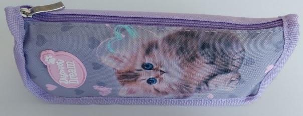 Piórnik z nadrukiem kotka, zamykany na zamek z jedną komorą. Doskonale nadaje się do szkoły.