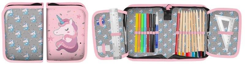 Piórnik jednokomorowy z dwoma klapkami z wyposażeniem (długopis, ołówek, 7 pisaków, 9 kredek, gumka, linijka, temperówka, ekierka). Zadrukowane kolorowe wnętrze.