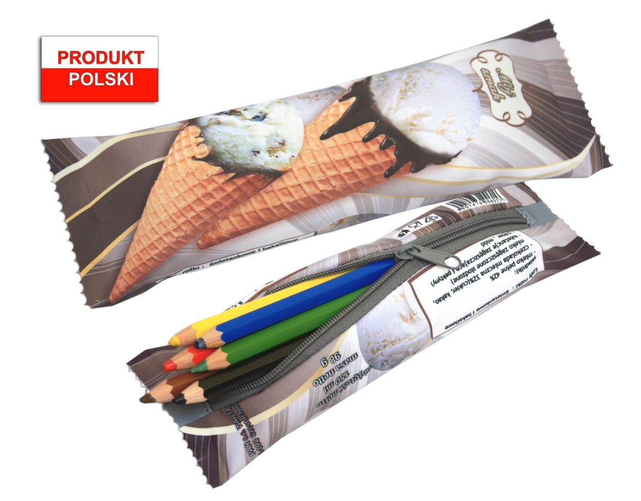 Piórnik wykonany z kodury, ozdobionej nadrukiem imitującym opakowanie z lodem. Piórnik o wymiarach 23,5x8[cm]. Piórnik zamykany na zamek błyskawiczny. Szara wersja kolorystyczna. Piórnik bez wyposażenia.