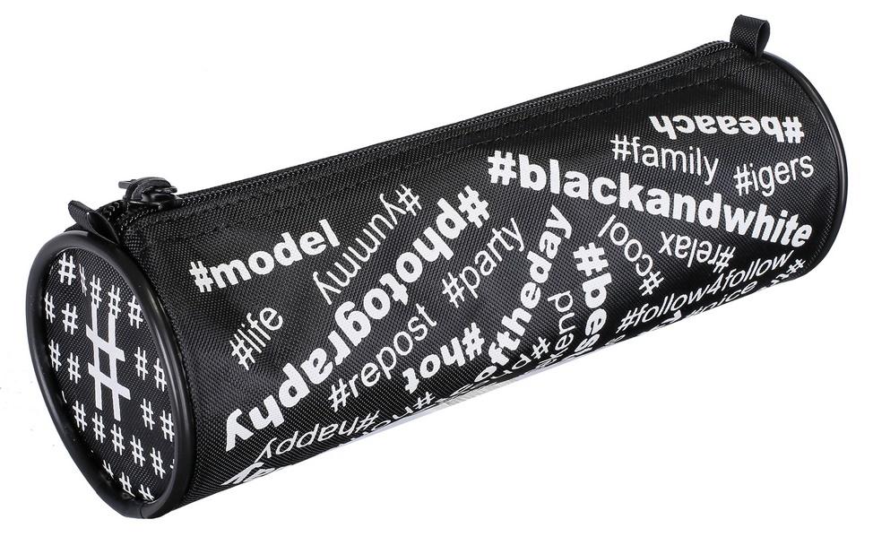 Piórnik tuba wykonany z gładkiej codury, ozdobiony modnymi napisami #.