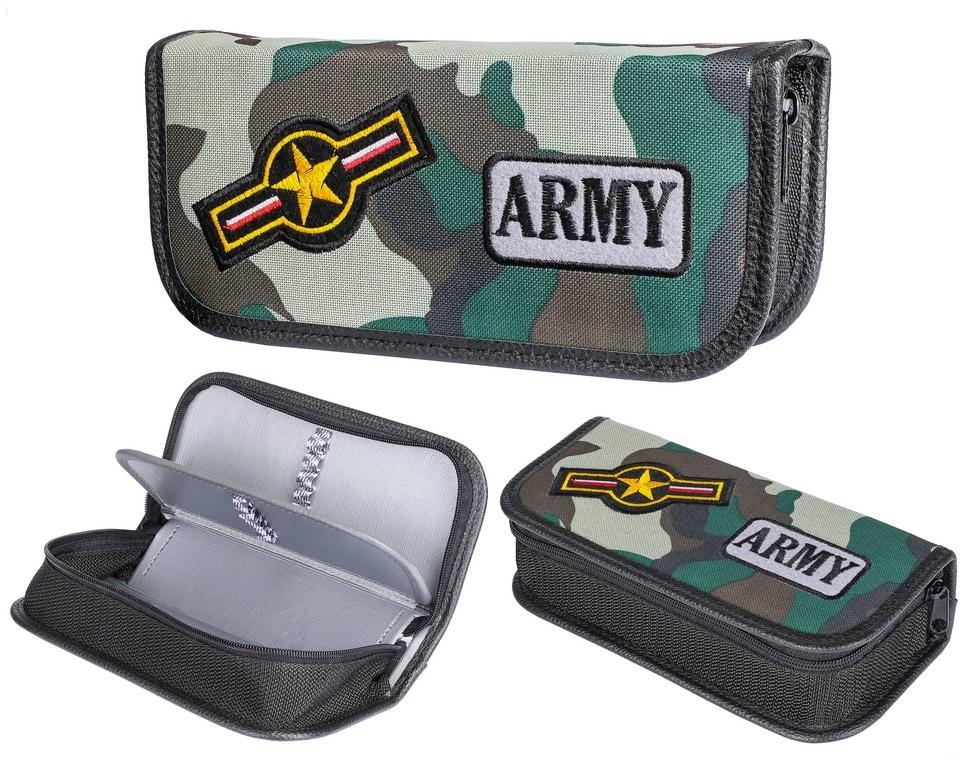 Piórnik kuferek XXL wykonany z codury moro, ozdobiony aplikacjami wojskowymi. W środku znajduje się klapka z gumkami na długopisy.