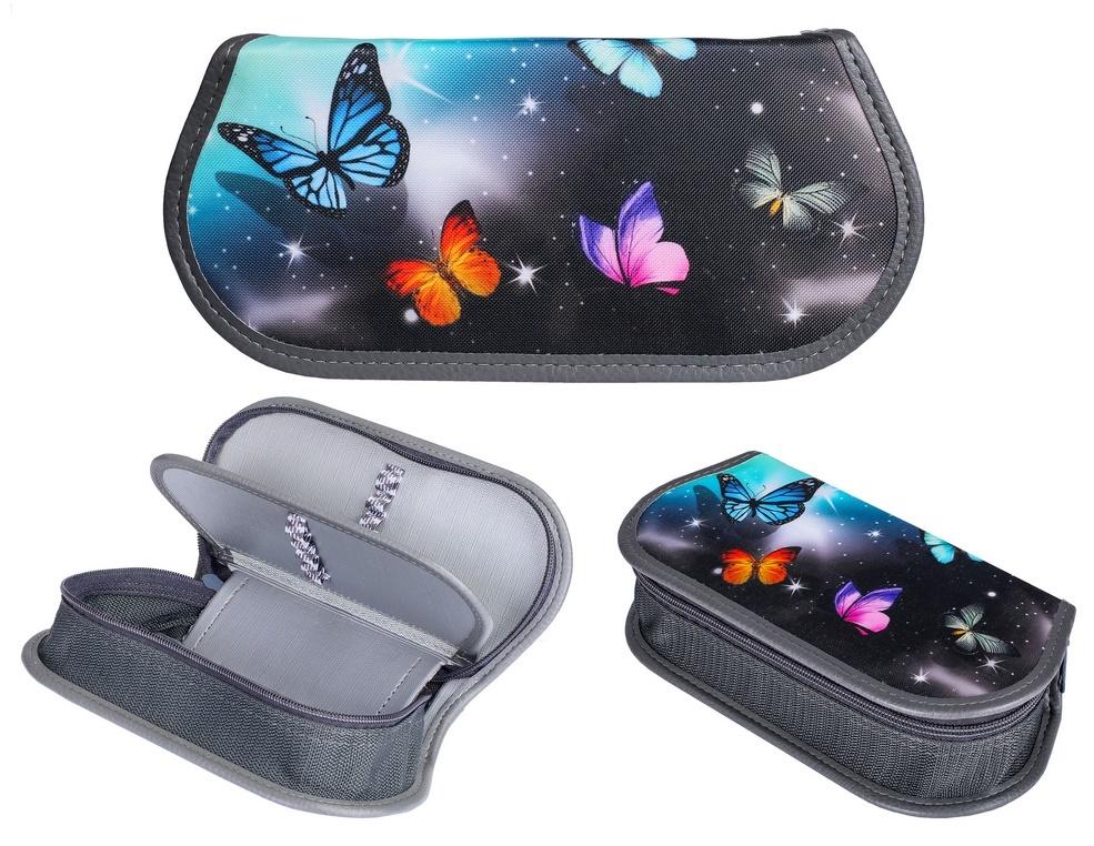 Piórnik typu kuferek sztywny dostępny w kilku kolorach, ozdobiony nadrukiem przedstawiającym motyle wykonanym w technologi termosublimacji. W środku klapka z gumkami na długopisy i przestrzeń luźna do wykorzystania. Wyrób zamykany na zamek błyskawiczny.