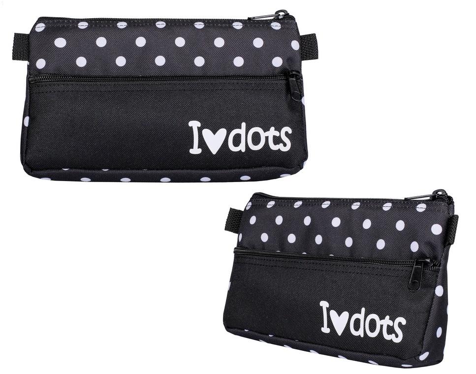 Piórnik typu kosmetyczka dostępny w kilku wersjach kolorystycznych. Piórnik zamykany na 2 zamki błyskawiczne. Wyrób ozdobiony napisem ,,I love dots '' wykonany metodą termosublimacji.