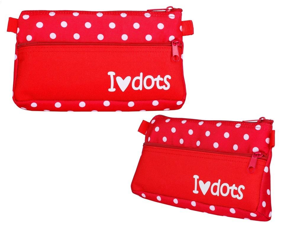 Piórnik typu kosmetyczka dostępny w kilku wersjach kolorystycznych. Piórnik zamykany na 2 zamki błyskawiczne. Wyrób ozdobiony napisem ,,I love dots '' wykonany metodą termosublimacji.