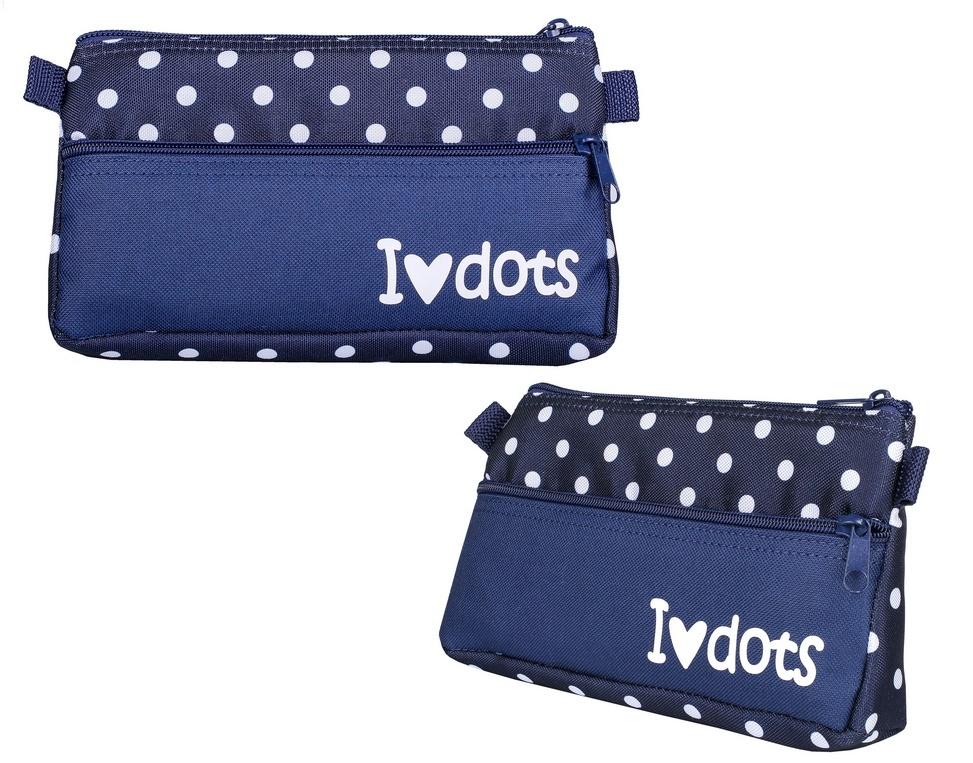 Piórnik typu kosmetyczka dostępny w kilku wersjach kolorystycznych. Piórnik zamykany na 2 zamki błyskawiczne. Wyrób ozdobiony napisem ,,I love dots '' wykonany metodą termosublimacji.