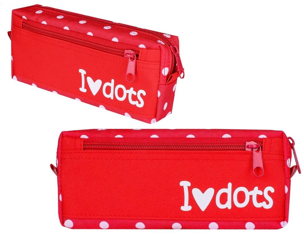 Piórnik typu kosmetyczka dostępny w kilku wersjach kolorystycznych. Piórnik zamykany na 2 zamki błyskawiczne. Wyrób ozdobiony napisem ,,I LOVE DOTS '' wykonany metodą termosublimacji.