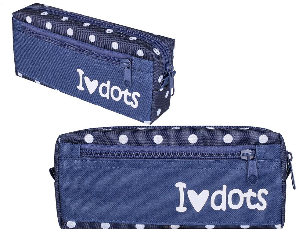 Piórnik typu kosmetyczka dostępny w kilku wersjach kolorystycznych. Piórnik zamykany na 2 zamki błyskawiczne. Wyrób ozdobiony napisem ,,I LOVE DOTS '' wykonany metodą termosublimacji.