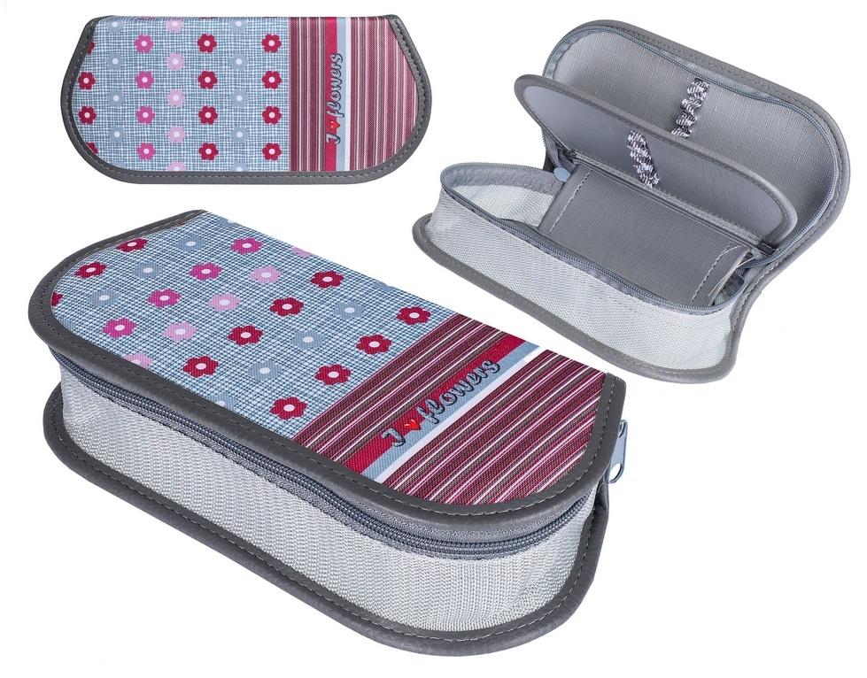 Piórnik typu kuferek sztywny dostępny w 2 kolorach, ozdobiony nadrukiem przedstawiającym kwiaty wykonanym w technologi termosublimacji. W środku klapka z gumkami na długopisy i przestrzeń luźna do wykorzystania. Wyrób zamykany na zamek błyskawiczny.