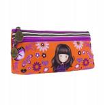 Piękny piórnik ozdobiony grafiką w odcieniach królewskiej purpury i nasyconego pomarańczu.